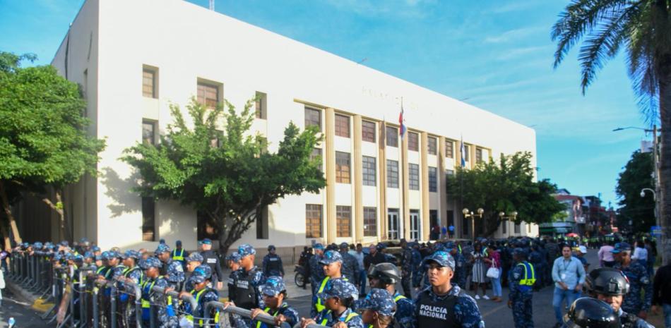 Más de 50 policías han sido desplegados este domingo en las afueras del Palacio de Justicia, donde el tribunal decidirá si dicta prisión domiciliaria o preventiva a Santiago Hazim y otros nueve imputados por el caso de presunta corrupción en el Seguro Nacional de Salud (Senasa).