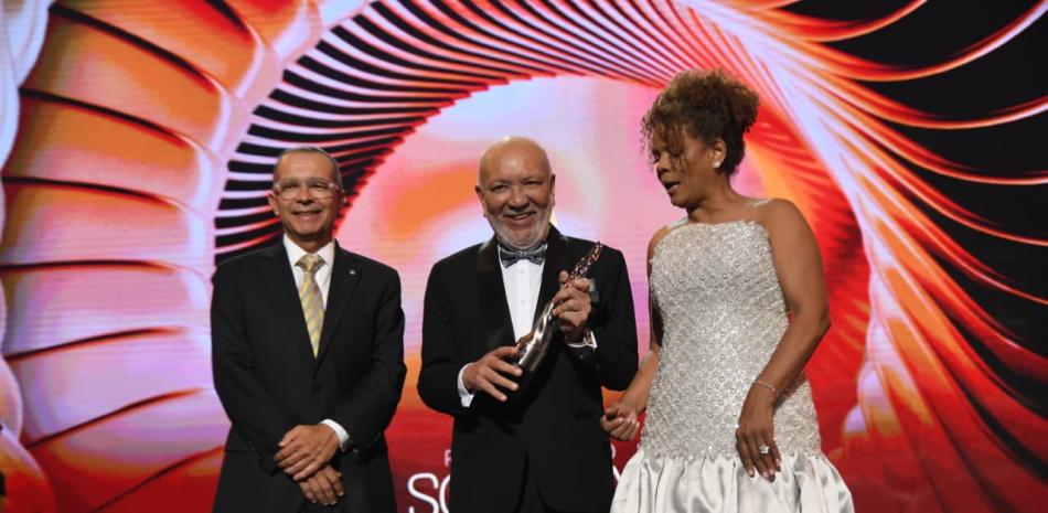 La presidenta de la Asociación de Cronistas de Arte (Acroarte), Marivell Contreras y Luis Álvarez, vicepresidente de la Cervecería Nacional Dominicana, le entregaron la estatuilla al veterano comunicador, creador del programa de radio "El Mismo Golpe" y "Divertido con Jochy".