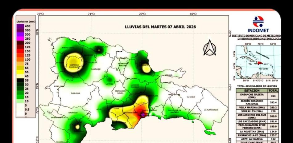 Allí, sectores como el Ensanche Julieta registró acumulados de 314.0 milímetros de agua, Villa Marina 280.2, Serrallés 220.0, Los Jardines del Ser 200.9, Los Cacicazgos 181.6, Prolongación 27 de Febrero 180.9, La Agustina 124.9, Ensanche La Fe 123.7.